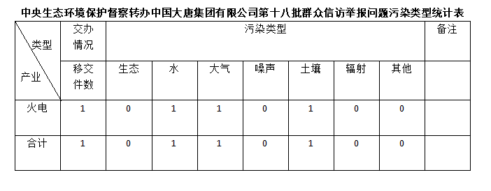 2025年6月27日,中央第七生態(tài)環(huán)境保護(hù)督察組向中國(guó)大唐集團(tuán)有限公司移交第十八批群眾信訪舉報(bào)件,共計(jì)1件,為來(lái)電舉報(bào),涉及水問(wèn)題1個(gè)、大氣問(wèn)題1個(gè)、土壤問(wèn)題1個(gè)。所有舉報(bào)件辦理工作已第一時(shí)間進(jìn)入調(diào)查核實(shí)辦理程序,辦理情況將按照相關(guān)要求反饋督察組,并及時(shí)向社會(huì)公開(kāi)。